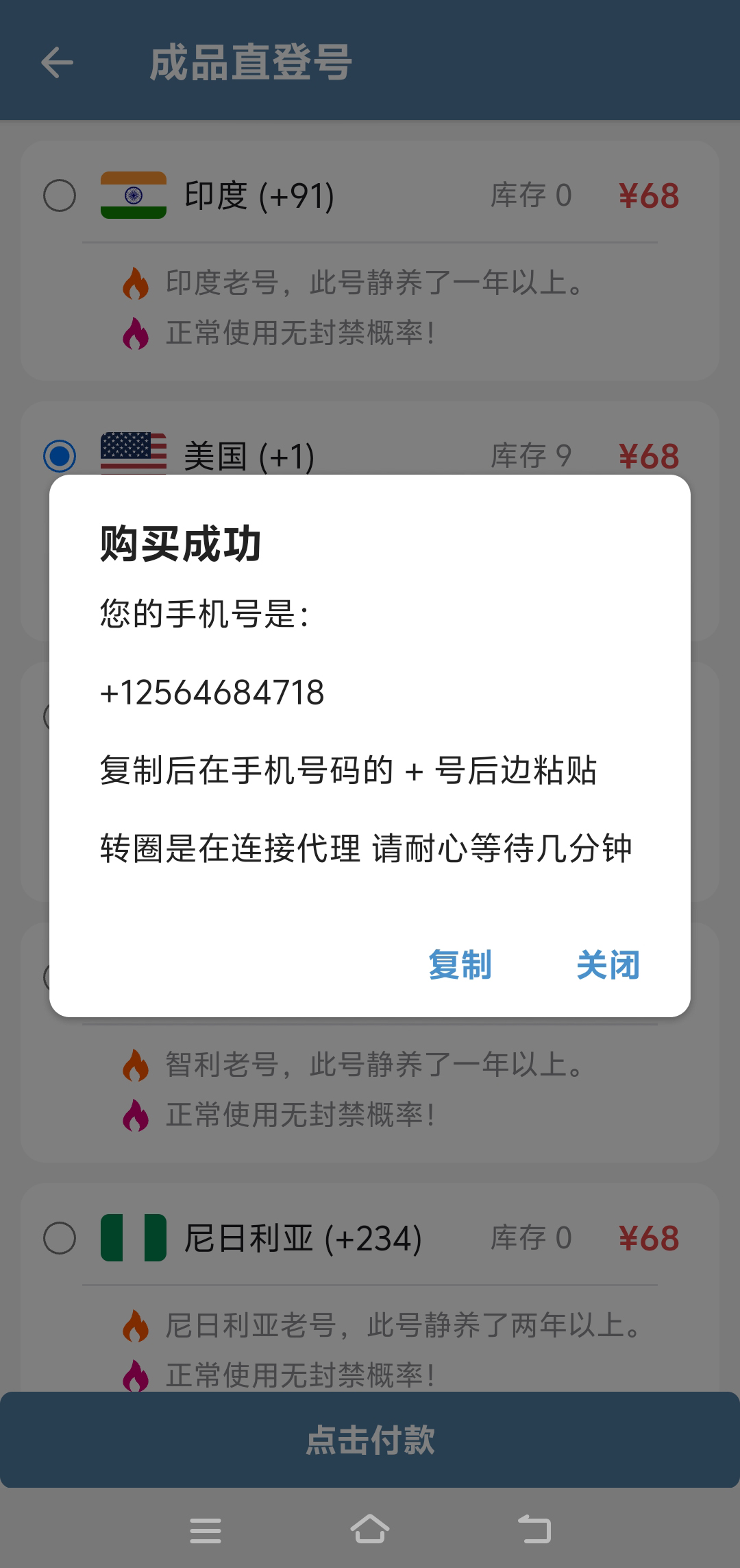 第4步:付款成功后 会弹出您购买的手机号